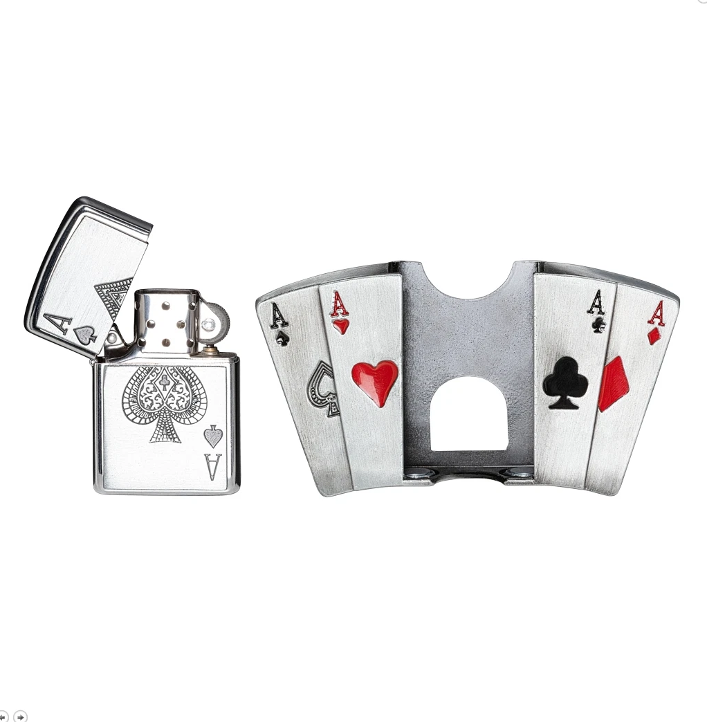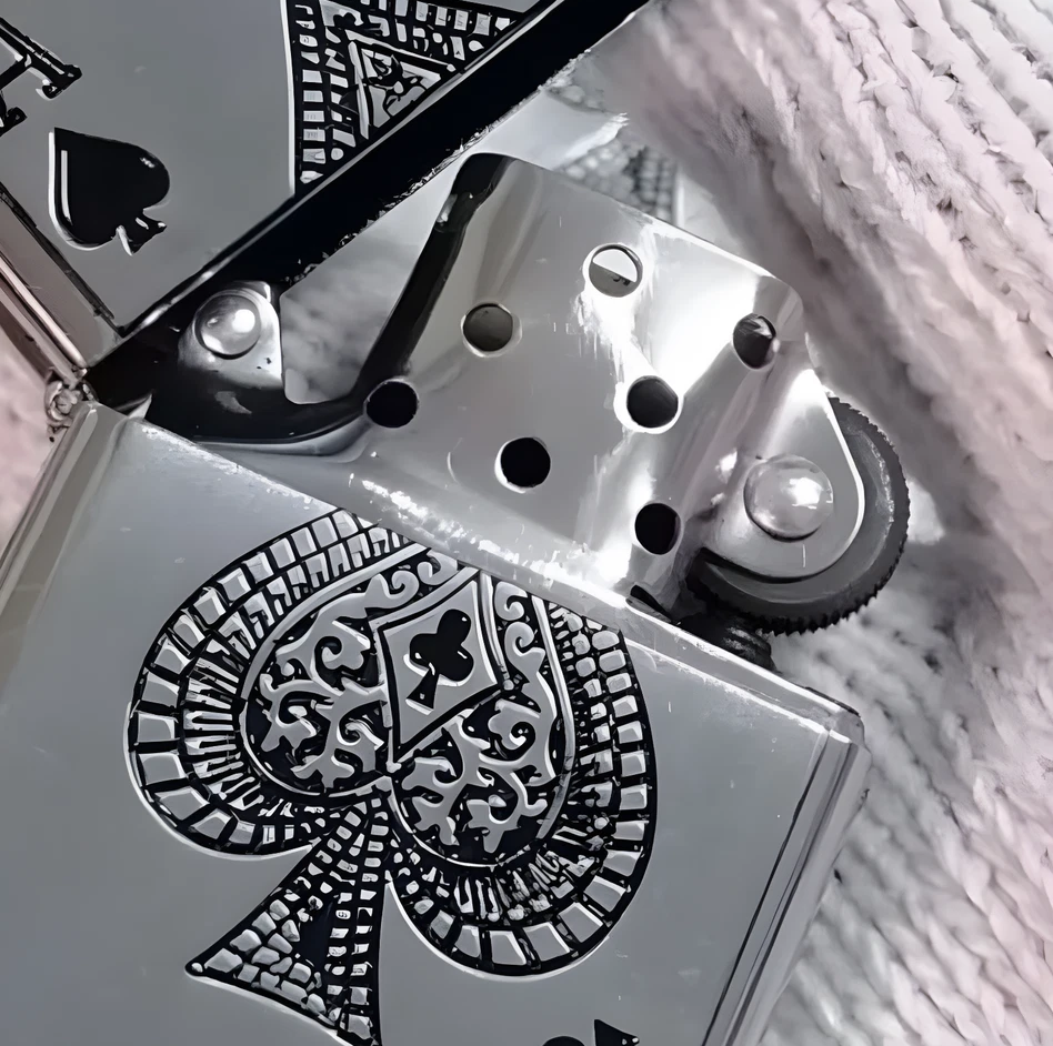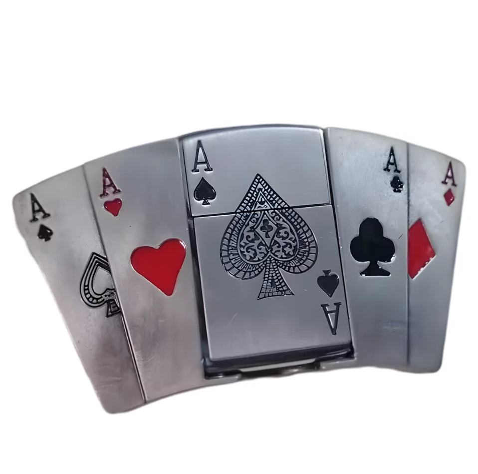 Ein echtes Highlight für Poker-Fans, Gambler und Liebhaber ausgefallener Biker-Accessoires. Dieses Set kombiniert eine massive Wechselschnalle mit einem voll funktionsfähigen Benzinfeuerzeug, das als zentrales Element der vier Asse dient.