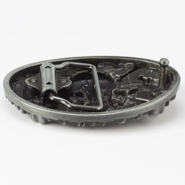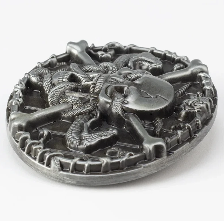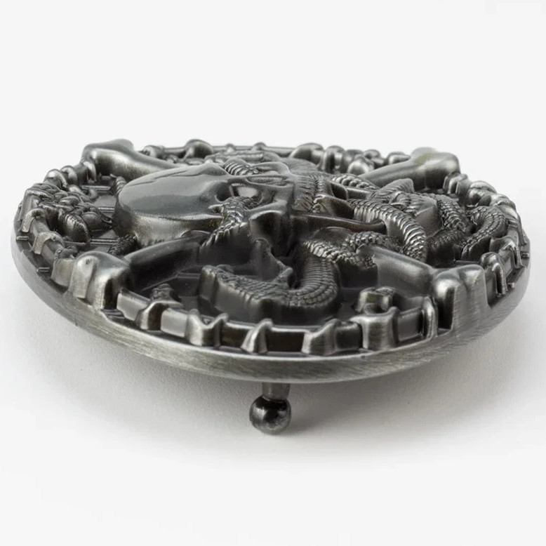 Ein kraftvolles Statement für alle Fans von Rocker-, Gothic- und Biker-Styles. Diese detailverliebte Wechselschnalle kombiniert klassische Memento-Mori-Symbolik mit einem Hauch von Romantik. Das zentrale Motiv eines gezeichneten Totenkopfs, durch dessen Augen und Mund sich Schlangen winden, macht dieses Buckle zu einem absoluten Blickfang.