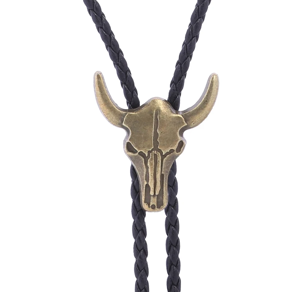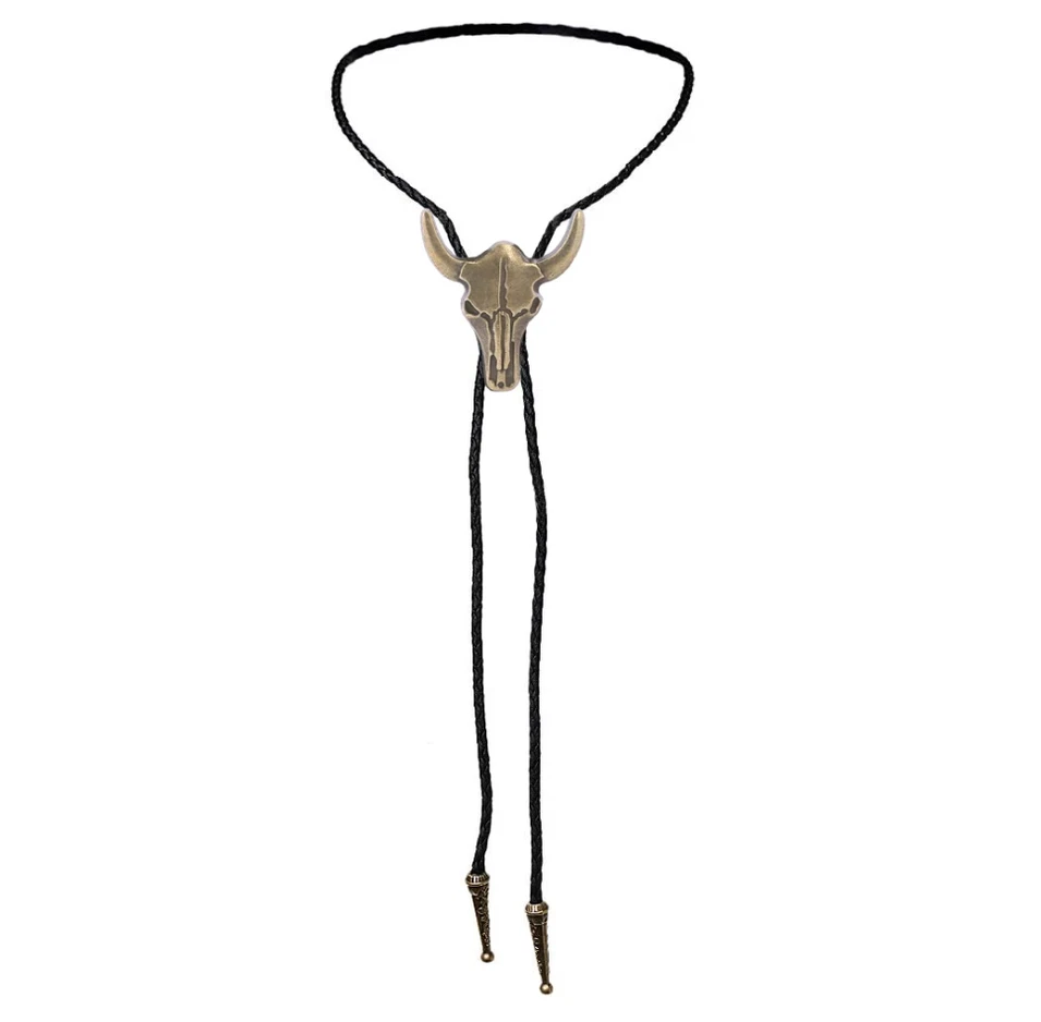 Dieser Bolo Tie ist die Essenz des Wilden Westens. Der markante Bullenschädel (Longhorn Skull) besticht durch seine klare Linienführung und das edle Bronze-Antik-Finish. Durch die dunkle Patinierung der Vertiefungen erhält das Motiv eine authentische, plastische Tiefe. Die schwarze, geflochtene Kordel wird durch den massiven Schieber gehalten, der eine stufenlose Anpassung ermöglicht. Den Abschluss bilden die passend in Bronze gehaltenen Metall-Spitzen (Aglets), die mit feinen floralen Ornamenten verziert sind. Ein kraftvolles Accessoire für Rodeo, Line-Dance oder als markantes Statement zum Biker-Outfit.